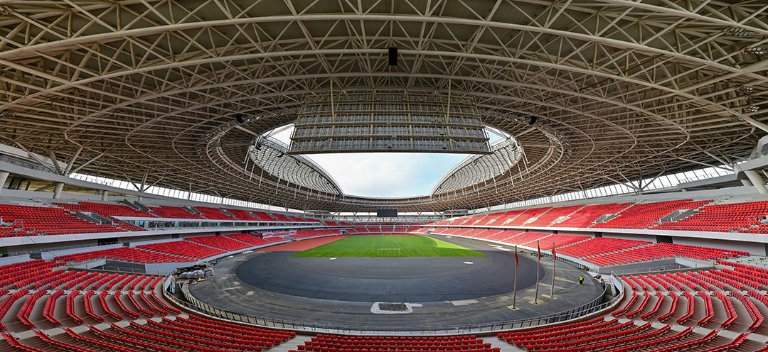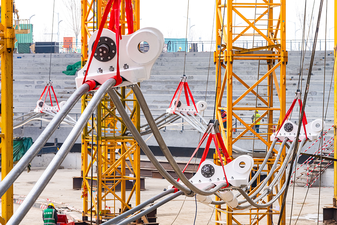 在施工過程中,巨力索具對體育中心徑向索與環(huán)梁部位采用了測力銷釘技術(shù)(具有拉索索力實時監(jiān)測功能,可實現(xiàn)體育場施工及運營期間的索力監(jiān)測),融合單層網(wǎng)殼與索承張拉技術(shù),4700噸鋼結(jié)構(gòu)屋蓋整體吊升,施工時在地面組裝完成,56小時毫米級精準(zhǔn)落位,刷新國內(nèi)體育場館施工紀(jì)錄。