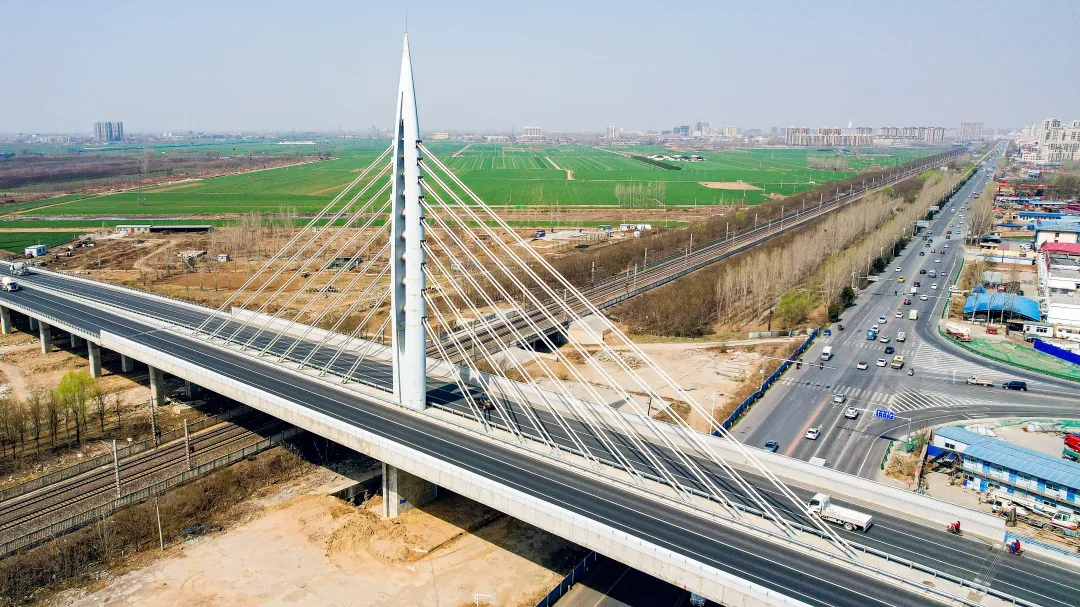 安大線建材通道徐水南外環(huán)與京廣鐵路斜拉轉(zhuǎn)體立交橋是雄安新區(qū)標(biāo)志性工程,能更好地保障雄安新區(qū)建材運輸通行能力和服務(wù)功能的發(fā)揮,緩解通往雄安新區(qū)的交通壓力,為過往車輛提供了快捷通暢的交通環(huán)境,從而實現(xiàn)路網(wǎng)連通、交匯、通達(dá)的集散功能。橋梁主體鋼結(jié)構(gòu)部分和斜拉索全部由巨力索具承接施工。