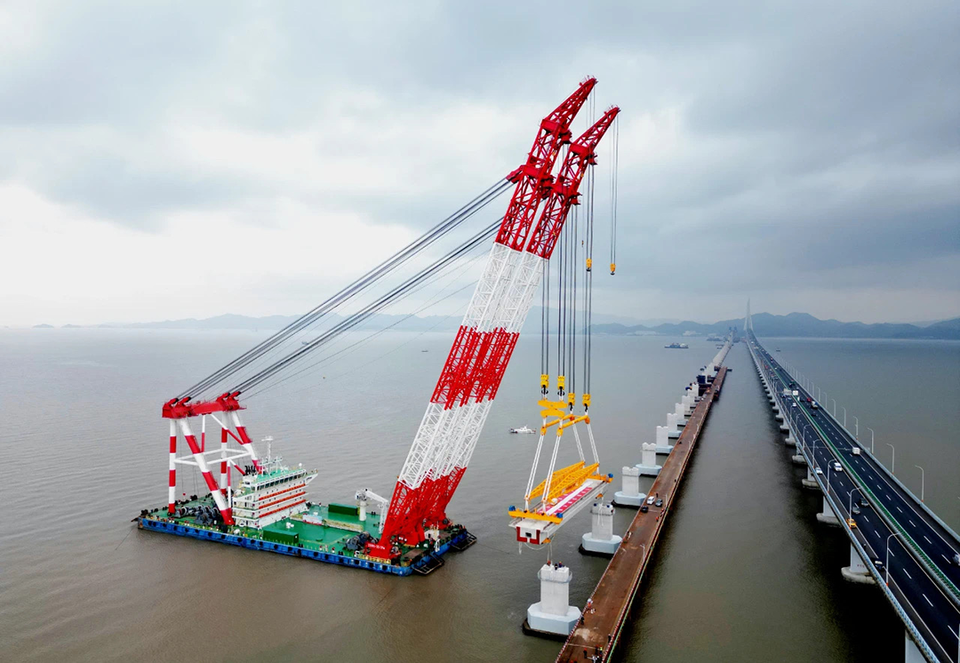 巨力索具針對復雜海況與空間限制,提供先進吊裝設備,研發定制化吊裝方案,與客戶單位通過三維建模模擬“鐵建大橋起1”號起重船吊裝路徑,動態調整船舶錨泊系統,將誤差控制在厘米級,配備吊運平衡系統與3D可視化動態監測系統,實時監控吊裝過程,同時制定了多套應急預案,確保鋼梁在強風、涌浪中穩定吊裝。這一系列技術突破,使“海上穿針”成為現實,為大橋主體結構施工奠定堅實基礎。