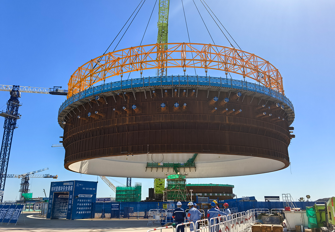 歷經4個小時的奮戰(zhàn),金七門核電1號機組鋼結構安全殼鋼襯里模塊一平穩(wěn)吊裝就位,為核島反應堆廠房內部結構和內外殼并行施工奠定了堅實基礎。