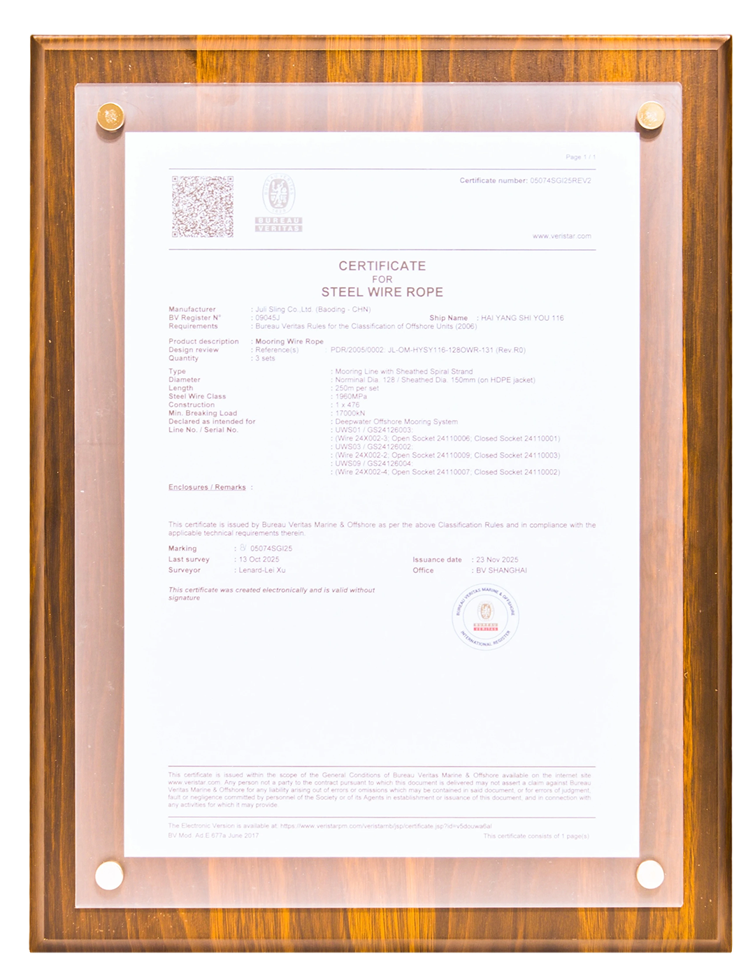 這張證書標志著中國首條打破國際壟斷的深海系泊鋼纜正式誕生,這不僅是對巨力索具技術實力的認可,更是中國海洋油氣開發領域系泊索、索節、卸扣國產化替代的零的突破。